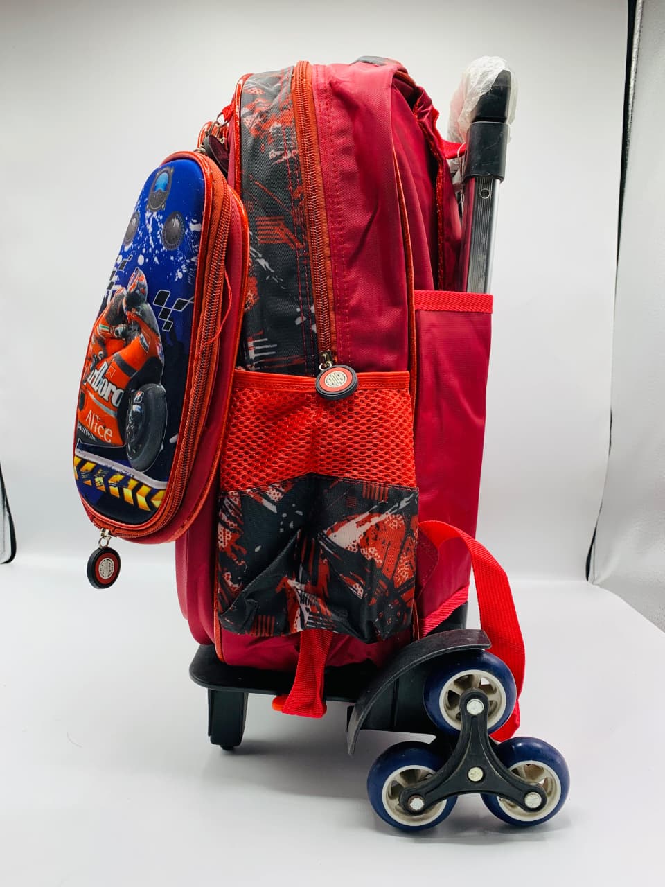 Get ready to zoom back to school with the ultimate 3-in-1 Biker Theme Kids Trolley School Backpack Combo, perfect for young speed enthusiasts! This exciting set includes a durable rolling backpack with a smooth-glide trolley system to lighten the load, a coordinating insulated lunch bag for mealtime pit stops, and a handy pencil case, all featuring a dynamic red and blue motorcycle racer design. Built with quality materials and eye-catching graphics that pop, this combination ensures your child stays organized, energized, and stylish whether they're in the classroom or cruising home.