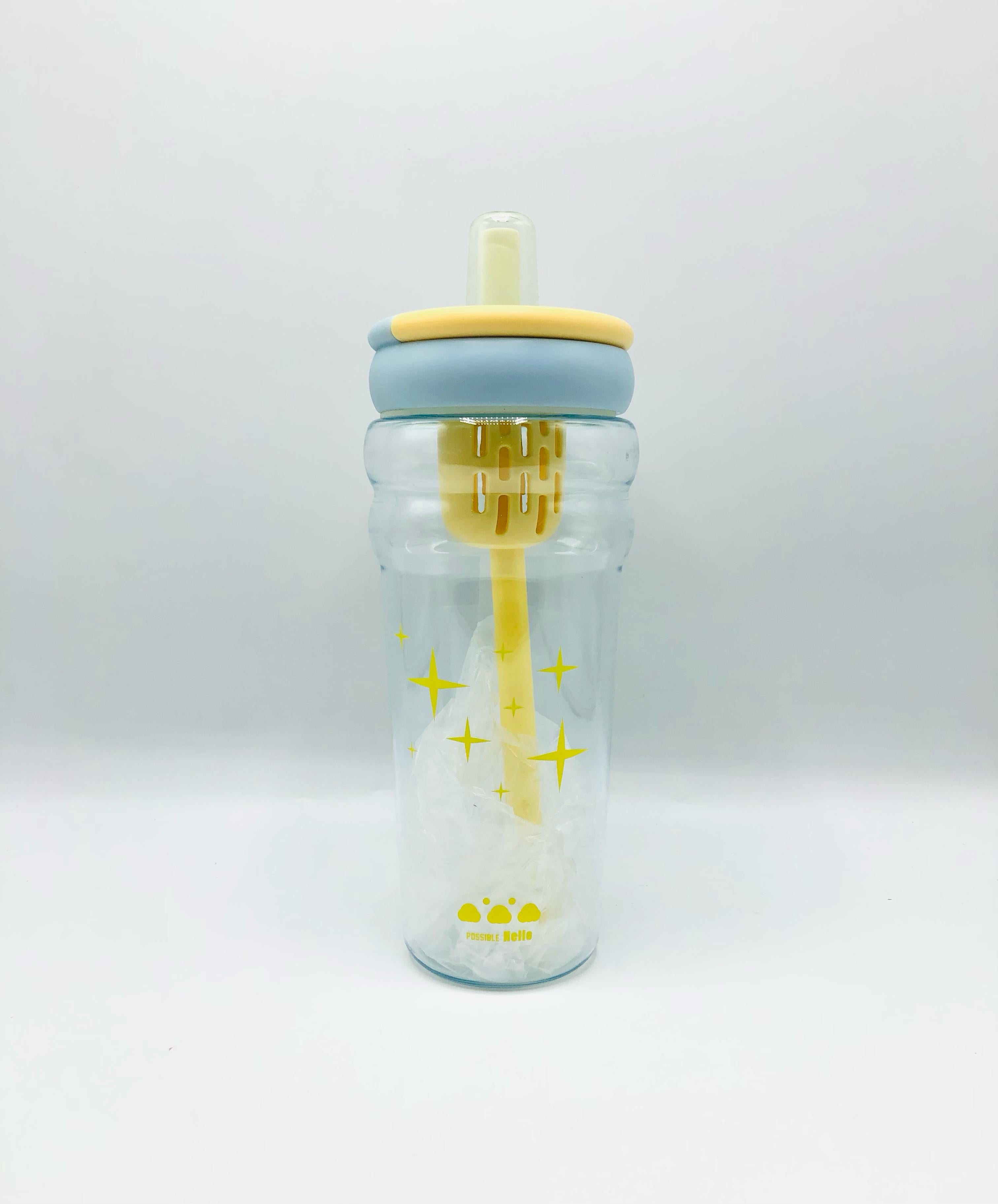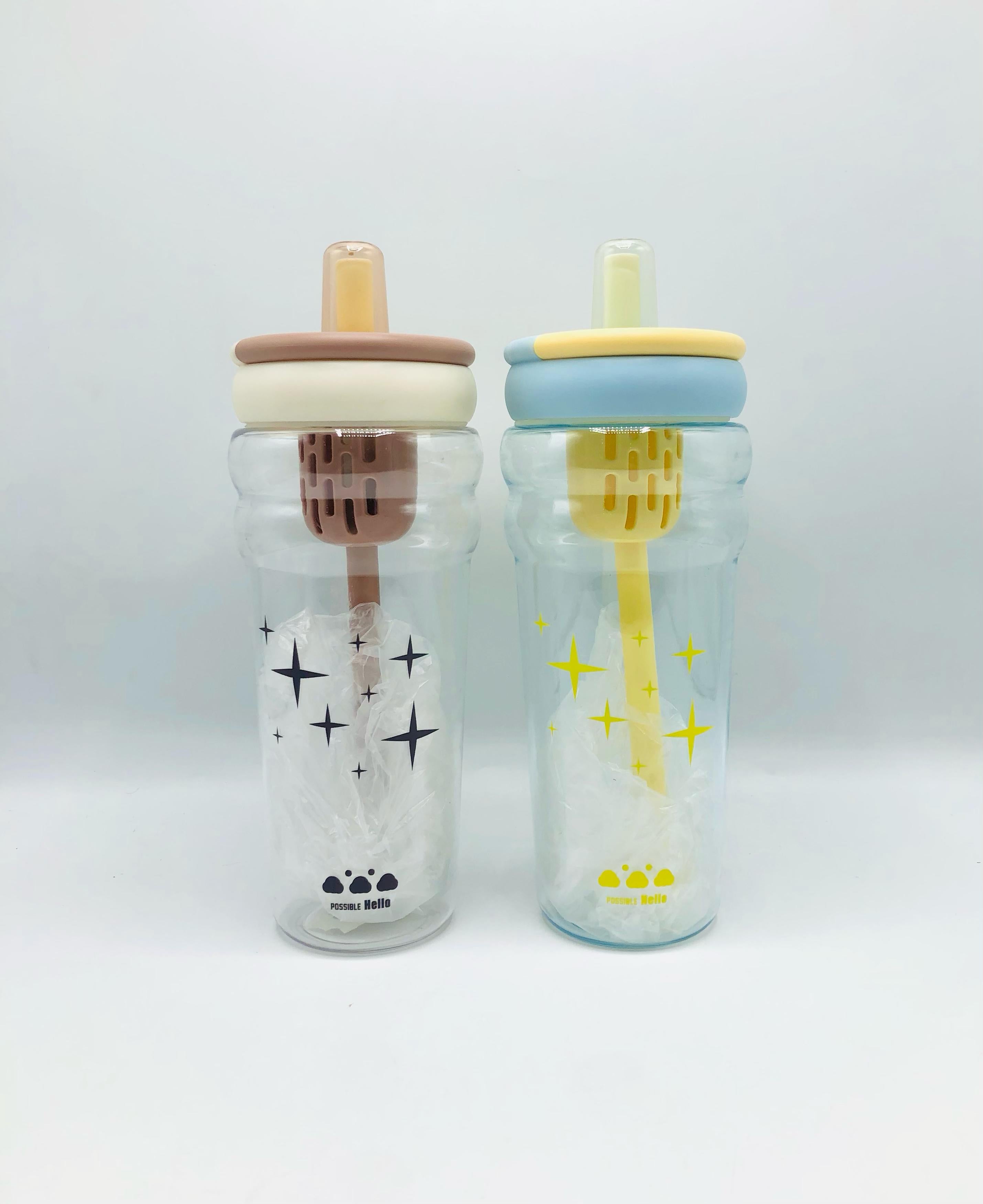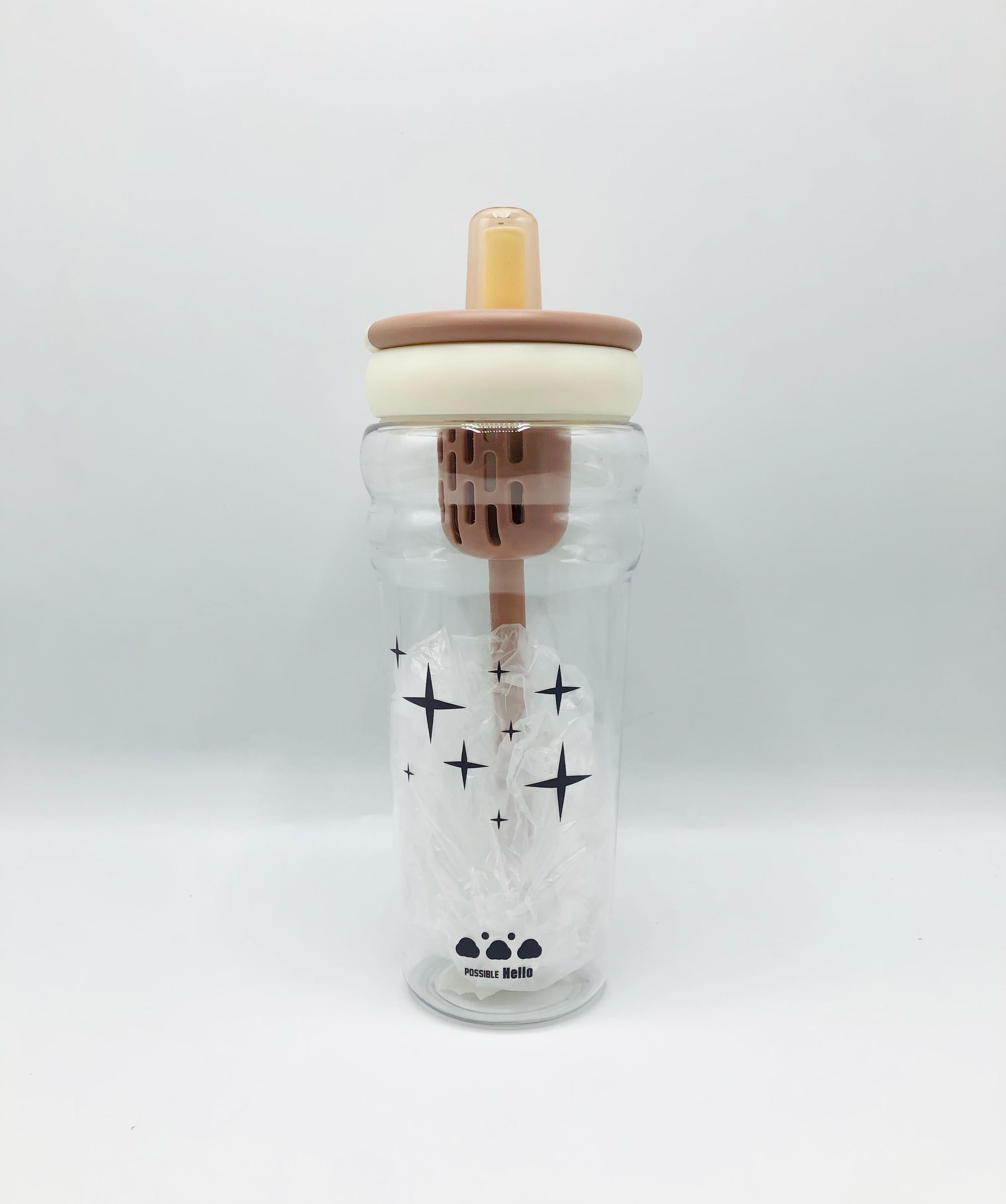 This is a stylish and modern baby feeding bottle featuring a soft silicone nipple in a muted beige tone, with a matching dual-colored screw cap in cream and light brown. The transparent bottle body is adorned with black star designs and has the phrase “Possible Hello” with a cute paw print logo near the base. Inside the bottle is a built-in mixing or anti-colic straw system with a vented filter component. The bottle design is both functional and visually appealing, perfect for modern parents looking for an aesthetic and practical baby accessory.